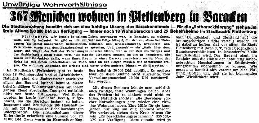 lebten. Ende April 1956 lebten in Plettenberg noch noch mehr, nämlich 817 Menschen in Baracken und Notunterkünften. Baracken